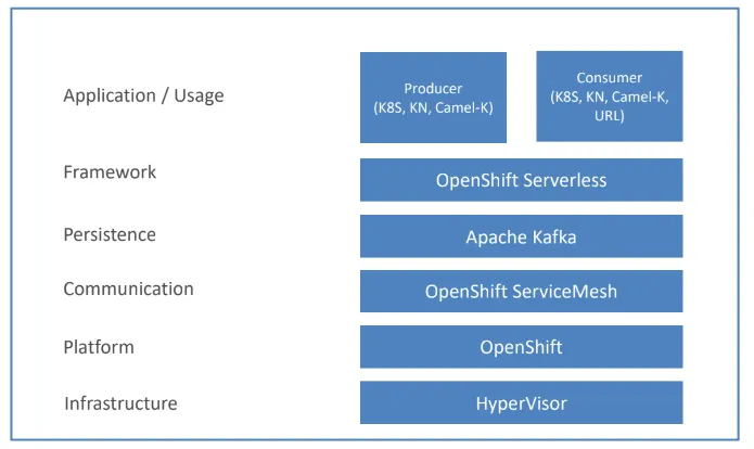 The blue box represents the central platform, and within it, we find the hypervisor, OpenShift, Apache Kafka, OpenShift Serverless, and on top of that we have consumers and producers that interact with the system through REST APIs and other functional interfaces.