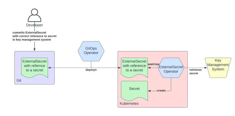 - Reference to secrets are stored in Git repositories and automation facilitates the retrieval of the actual secrets based on these references. Finally the retrieved secrets are rendered as Kubernetes Secrets.