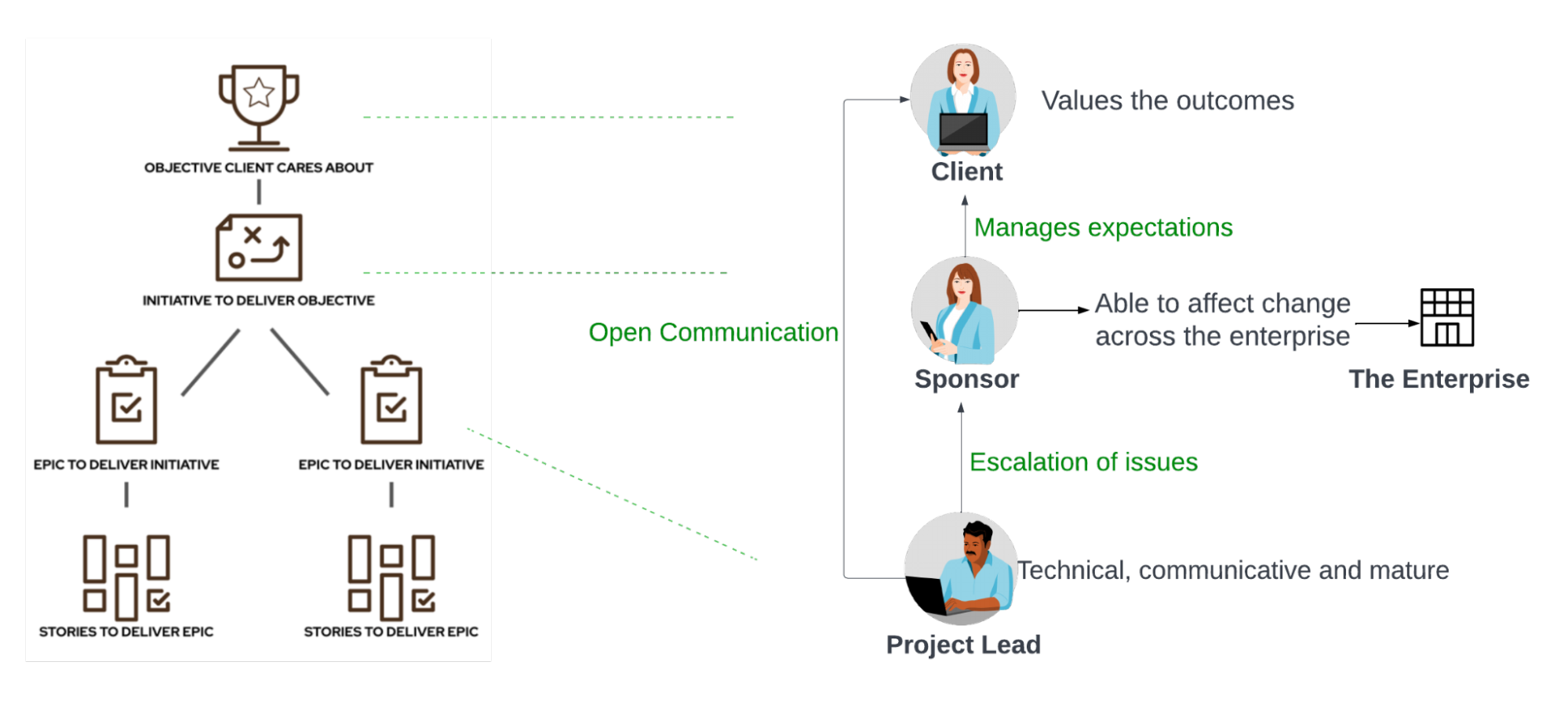 Any changes to this structure (initiatives and timeframes) need to have the input of the Project Lead and be validated by the Client. If problems arise (e.g., unrealistic timelines or scope changes that require difficult-to-obtain resources in the enterprise), the Sponsor will need to step in to help resolve the issue.