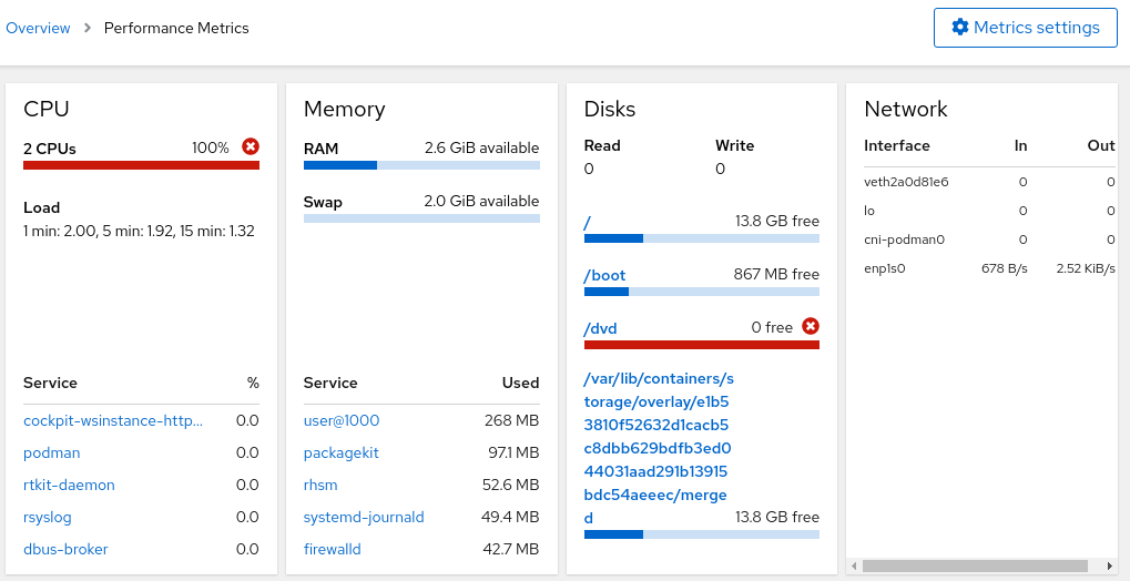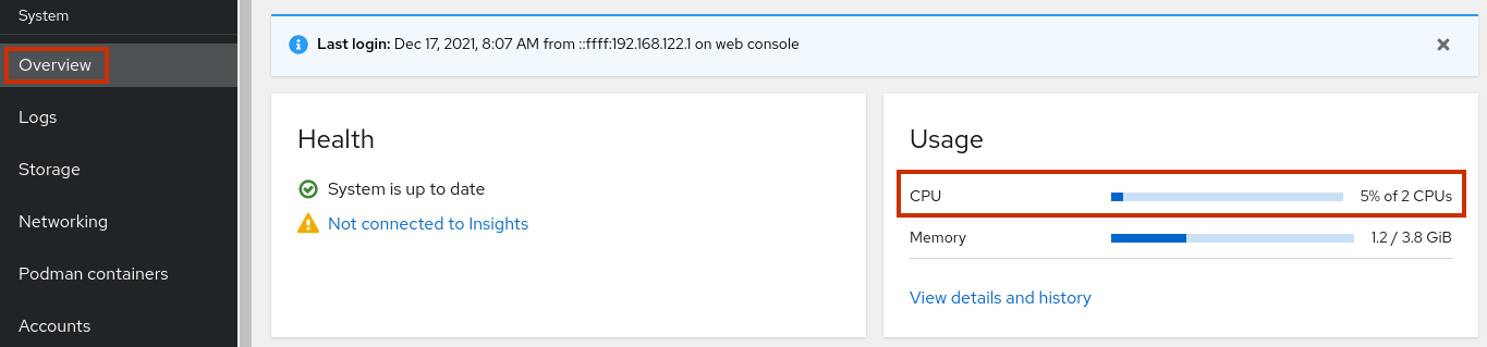 To access historical performance metric graphs in the Web Console, you’ll also need to have the cockpit-pcp package installed, and the pmlogger.service systemd service enabled/started. These steps can be done from the command line, or you’ll be prompted to complete these steps in the Web Console after you click the View details and history link under the Usage card on the Overview page.