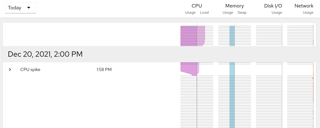 In RHEL 8.4, we introduced the ability for the Web Console to identify when resource usage spikes occurred (for example, a CPU spike). In RHEL 8.5 and RHEL 9 beta, we’ve extended this functionality to also show what was logged on the system around the time the spike occurred.