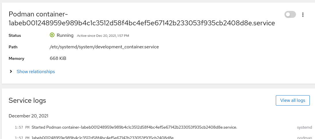 On the log entry page, I can see the details of this log entry. In the top right, I’ll click the link to see details about the systemd service that started the container, development_container.service.