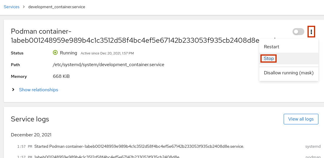 To stop a container started from a systemd service, I’ll need to go back to the development_container.service systemd service in the Services section of the Web Console. From there, I can click on the dots in the upper right corner, and click Stop, as shown: