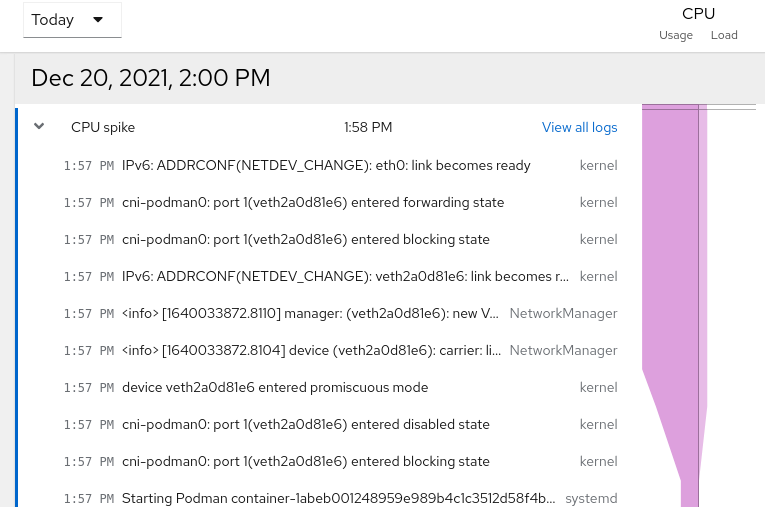 In this screenshot, the Web Console shows there was a CPU spike at 1:58 PM, and in addition, it shows log entries that occurred around this time. One of those log entries is related to systemd starting a Podman container (the bottom log entry in the screenshot).