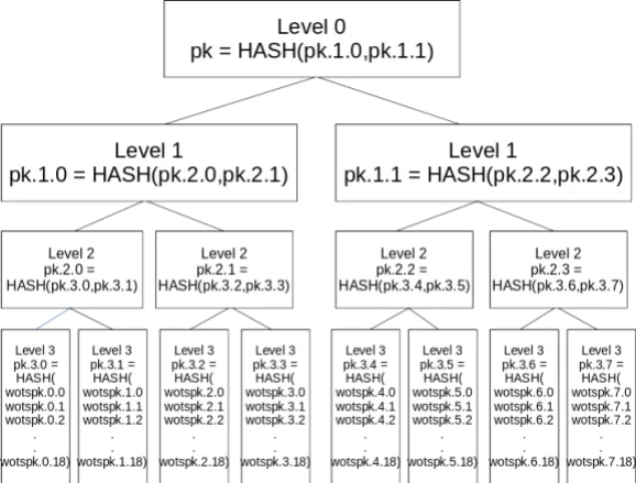 Bit Private Key 0 Private Key 1 Public Key 0 Public Key 1 0 sk0.0 sk0.1 pk0.0=HASH(sk.0.0) pk0.1=HASH(sk.0.1) 1 sk1.0 sk1.1 pk1.0=HASH(sk.1.0) pk0.1=HASH(sk.1.1) 2 sk2.0 sk2.1 pk2.0=HASH(sk.2.0) pk0.1=HASH(sk.2.1) . . . . . . . . . . 62 sk62.0 sk62.1 pk62.0=HASH(sk.62.0) pk62.1=HASH(sk.0.1) 63 sk63.0 sk63.1 pk63.0=HASH(sk.63.0) pk63.1=HASH(sk.0.1)
