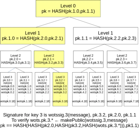 v=0, HASH(HASH(HASH(HASH(sig)))) = pk v=1, HASH(HASH(HASH(sig))) = pk v=2, HASH(HASH(sig))) = pk v=3, HASH(sig) = pk