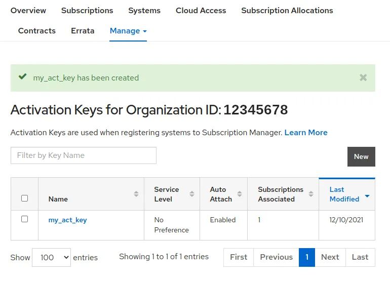 Next, you can click on the Manage tab drop-down menu and select Activation Keys. On this screen you can click on New to create and name your own activation key, as well as associate the desired subscriptions you wish to be associated with the activation key. Using an activation key allows you to choose which of your subscriptions are used for different use cases or users, as well as avoids the need to use username and password credentials to your account for your build workflow.