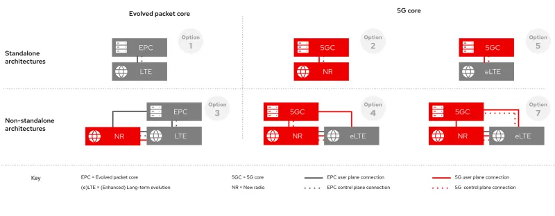 The third-generation partnership project (3GPP) has outlined many options for service providers to transition towards a 5G core network. Option one is the current state for service providers with a 4G network.