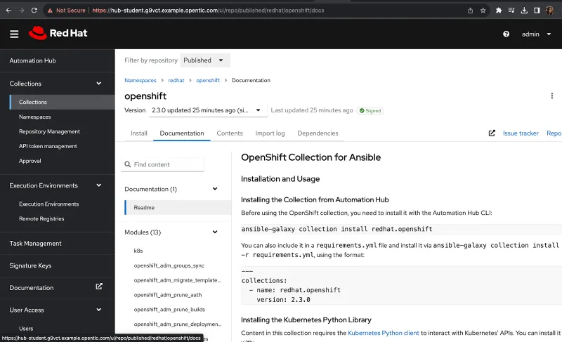 As a preliminary step, I have downloaded the Red Hat Certified Collection for OpenShift in private automation hub as shown below: