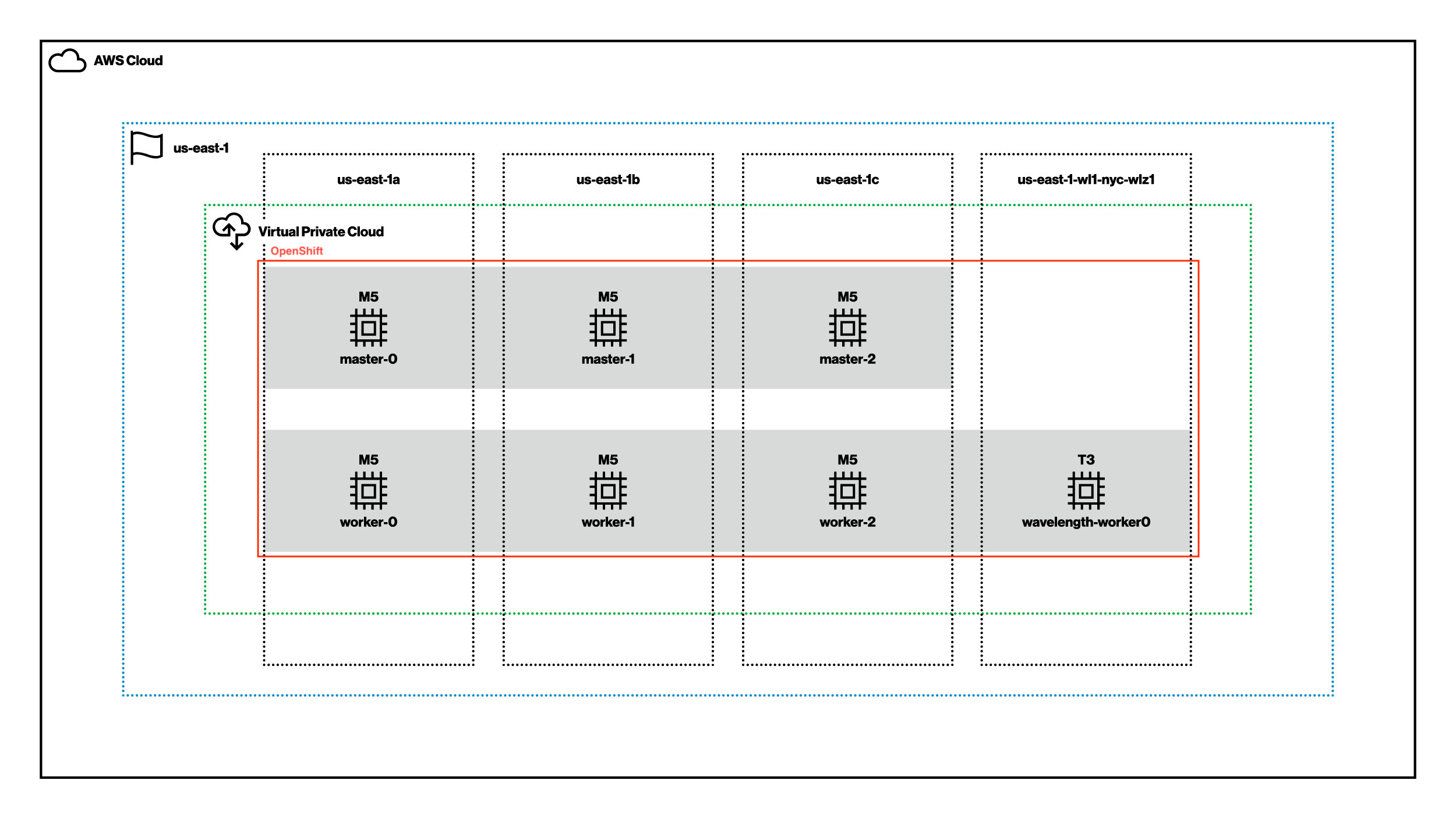 Para probar que el diseño funcionaba, de hecho, creamos un clúster de Red Hat OpenShift en tres zonas de disponibilidad en el norte de Virginia, zonas de Wavelength en Nueva York y Boston, y un Outpost dedicado en Texas. Todo ello con menos de 200 líneas de YAML (otro lenguaje de marcado).