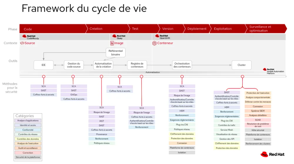Maintenant que vous vous êtes posé toutes ces questions, vous pourrez comprendre comment Red Hat tire parti de son écosystème de partenaires pour assurer la sécurité du cycle de vie des conteneurs et le DevSecOps. Ce diagramme vous donne un aperçu de ce que devrait être un écosystème selon Red Hat :