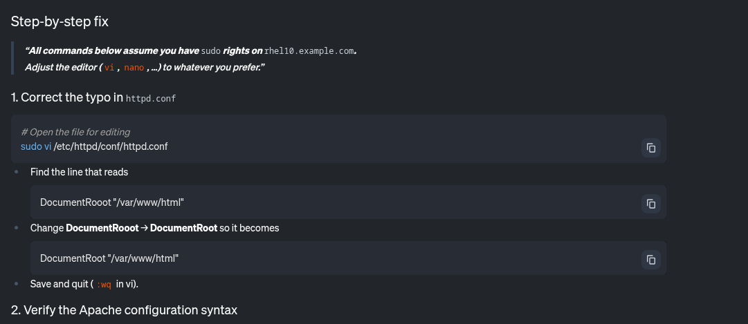 Enfin, je vais également demander au LLM de m'aider avec httpd.service, qui a déjà été signalé comme défaillant.