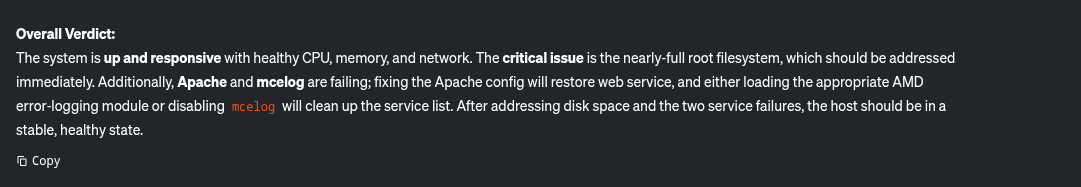 Sur cette base, le LLM fournit un aperçu du système et de son intégrité, notamment dans le tableau suivant :