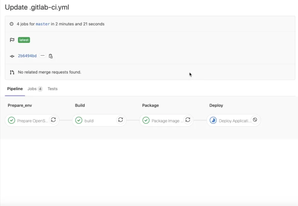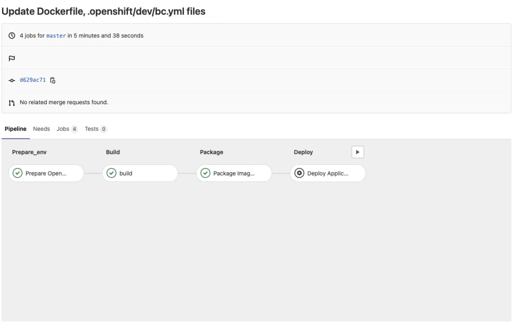 “Looks good - let’s now create a merge request, and approve it. After a few minutes, we can start to see our pipeline jobs have all successfully passed, up to the final ‘deploy’ stage, which requires manual intervention:”