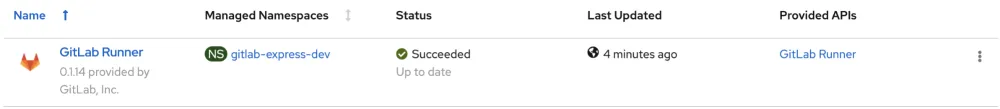 oc get runners NAME AGE gitlab-runner 5m oc get pods NAME READY STATUS RESTARTS AGE gitlab-runner-bf9894bdb-wplxn 1/1 Running 0 5m