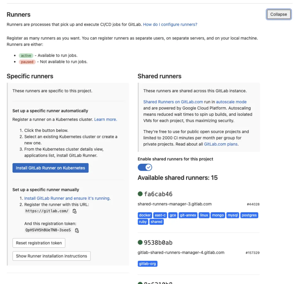 “Now we need to tell GitLab about our runner, and establish a connection. To do this, we’ll need to head to the GitLab project’s Settings page, and click on ‘CI/CD.’ Next we expand the ‘Runners’ section. You can see that we have an option to ‘Set up a specific runner manually.’ We will need to copy the registration token and set up a secret in our OpenShift project.”