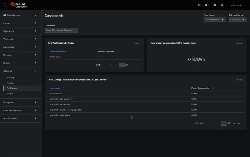 OpenShift users can now access a Dev Preview of power monitoring for Red Hat OpenShift via the Web Console. By installing the newly-released Kepler Operator, as described in the section above, users can make use of two dashboards under the Observe>Dashboards UI - both providing different levels of details around power consumption metrics for a single cluster: (1) Power Monitoring / Overview and (2) Power Monitoring / Namespace.
