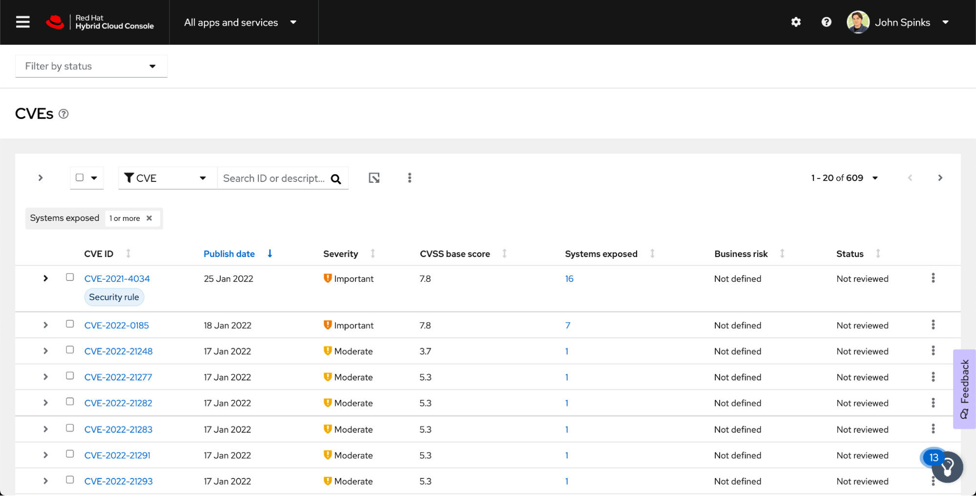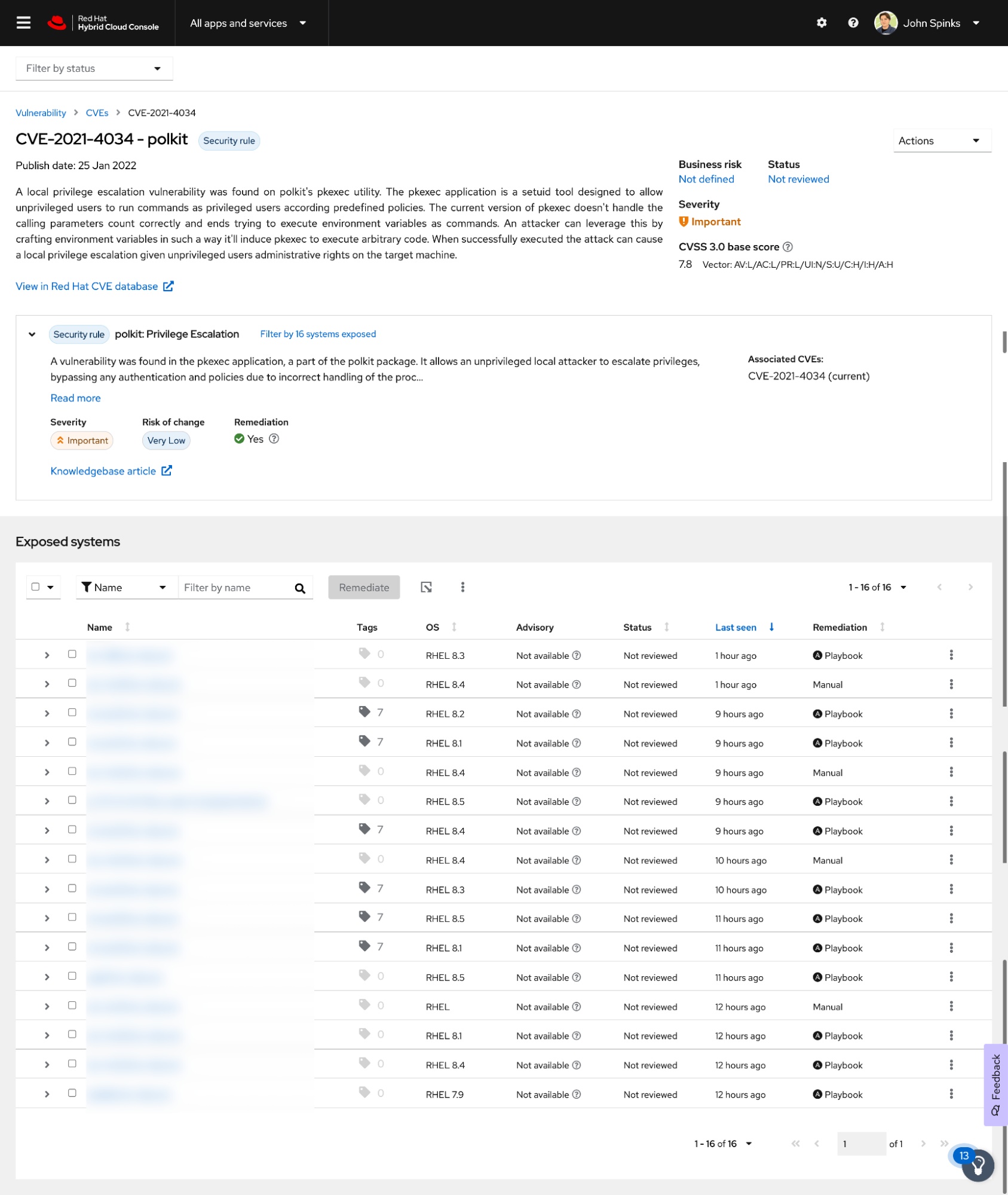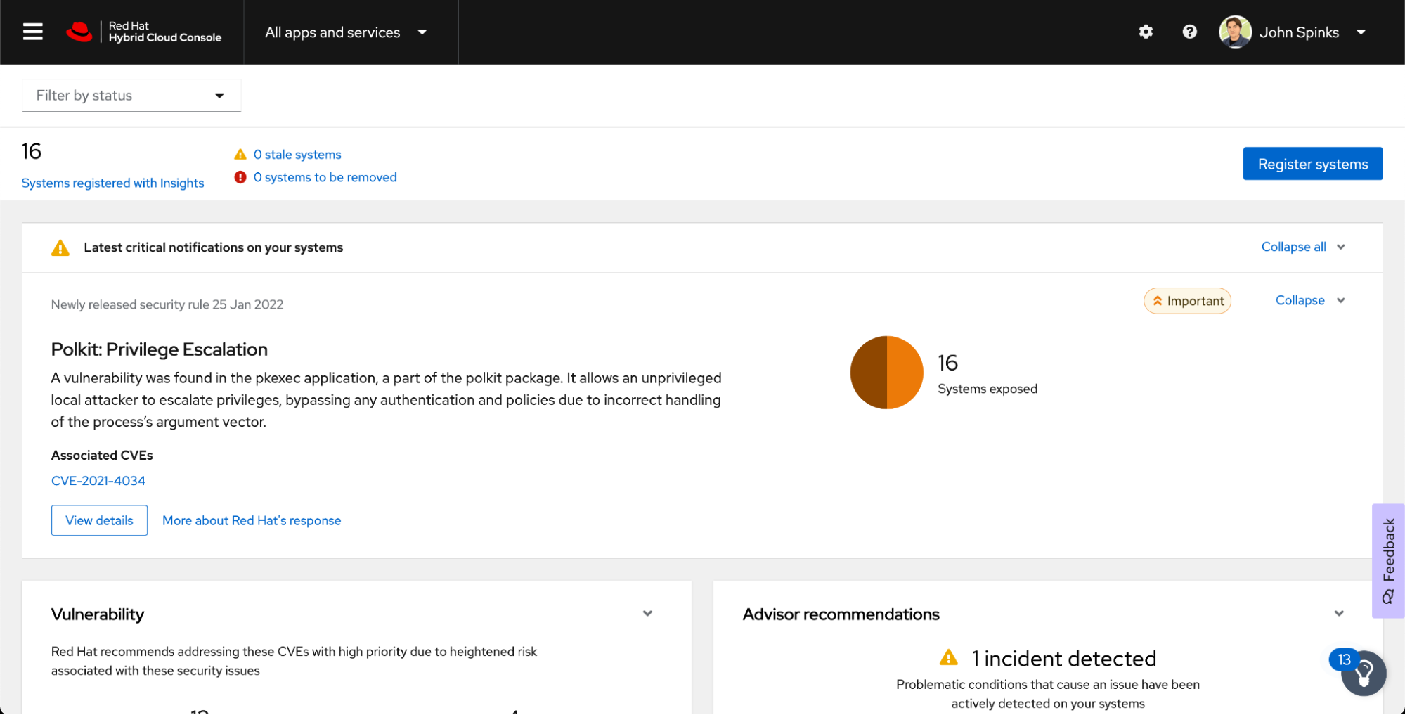 Right on the Dashboard of Insights for Red Hat Enterprise Linux is the latest vulnerability - Polkit, pwnkit, or CVE-2121-4034.