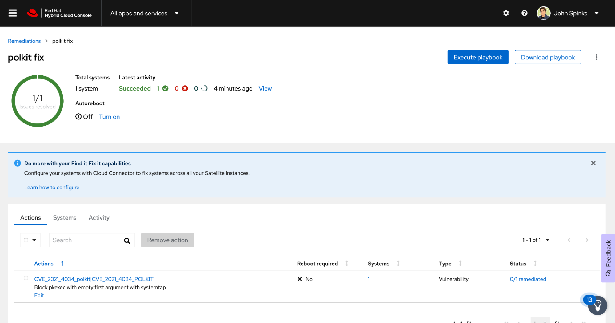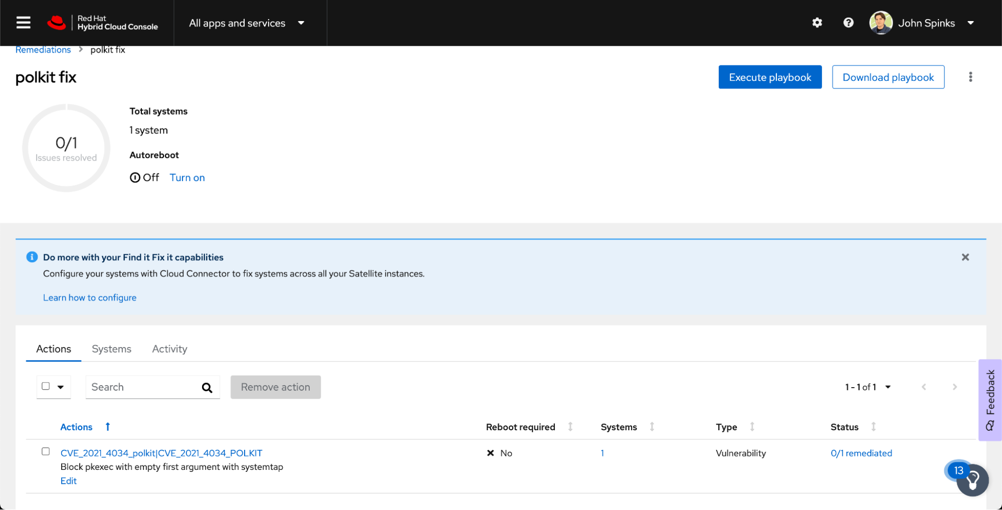 It is important to know that Insights doesn’t just help you with knowing if you are vulnerable - it helps you remediate the issue in your environment with as little friction as possible. Of systems impacted, one is a test system that doesn’t have any critical workloads on it. I’m going to start by fixing this on a single system just to see how it goes.