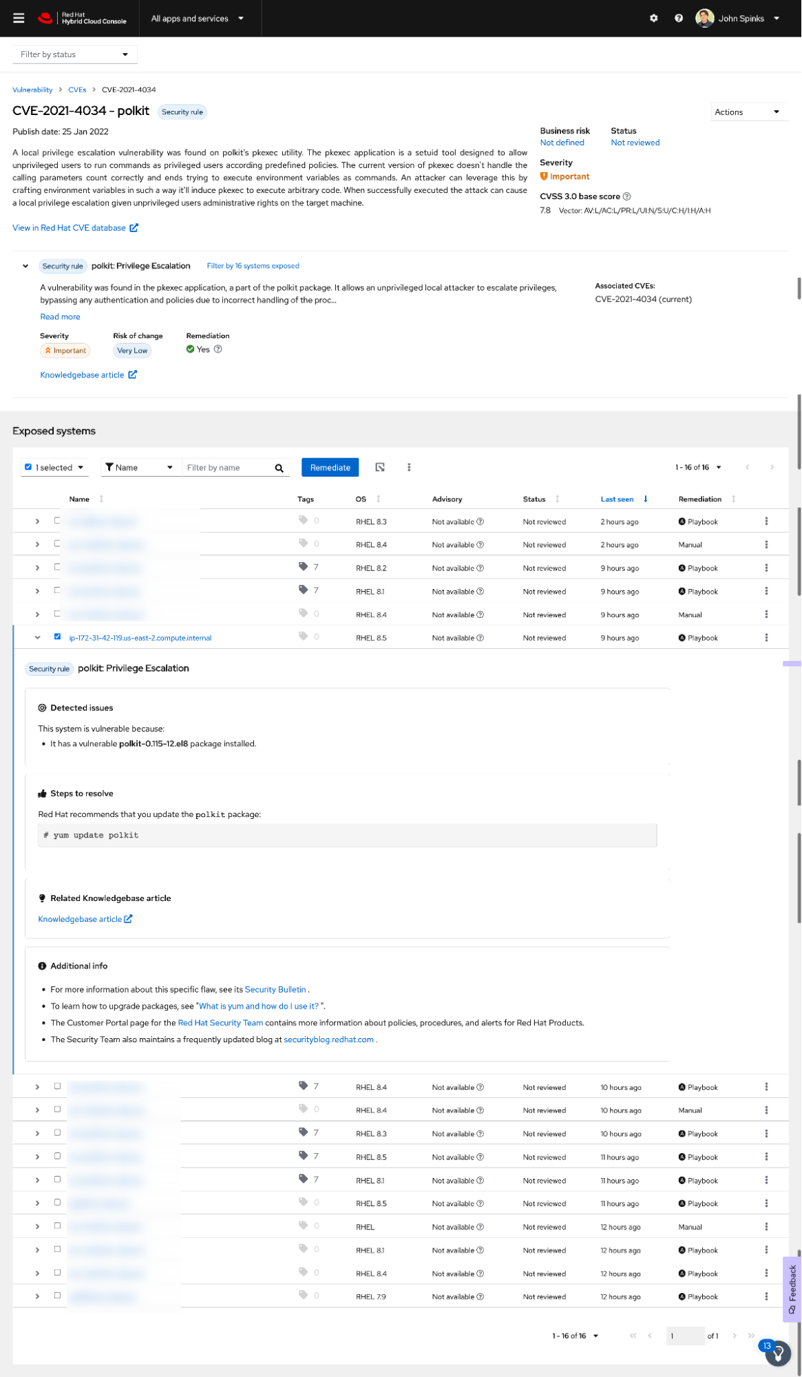 If I expand the view of this system, Insights will tell me what I need to do to fix this vulnerability, specific to this version of RHEL. In this case, we are just updating the package using: yum update polkit.