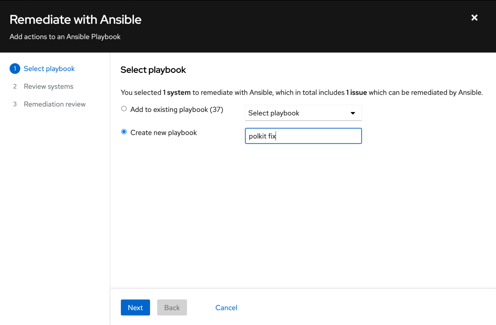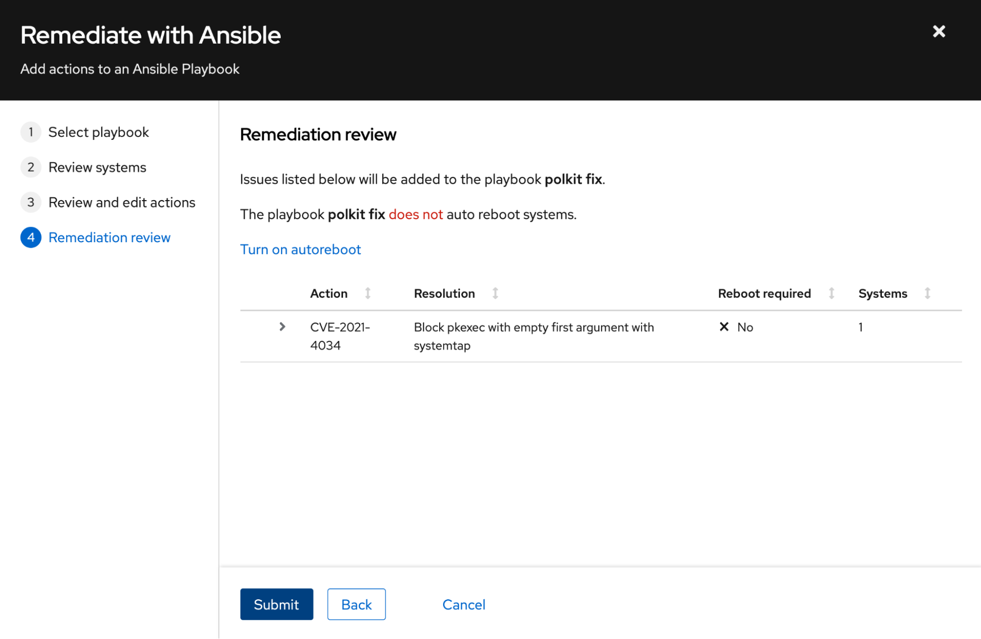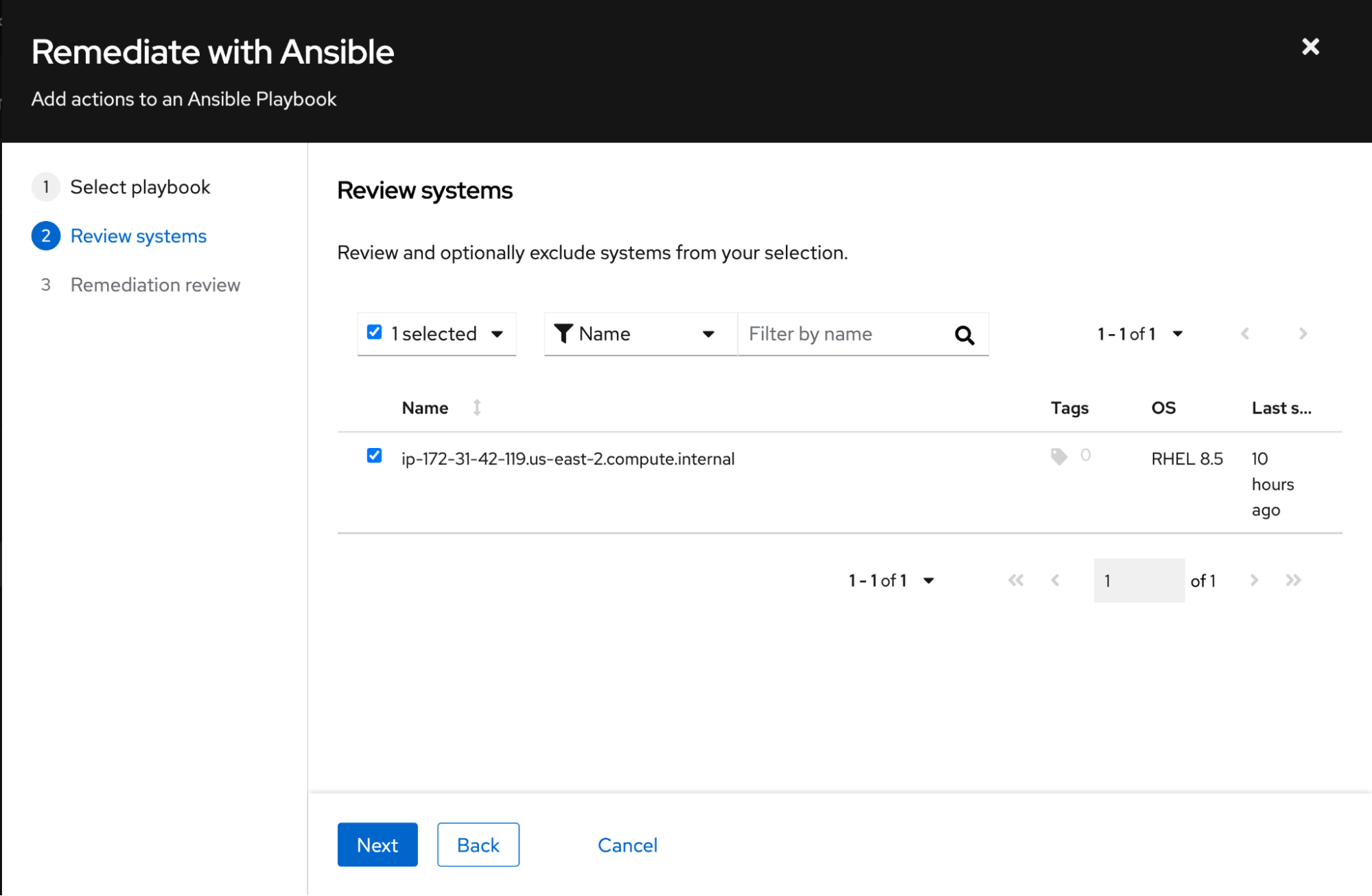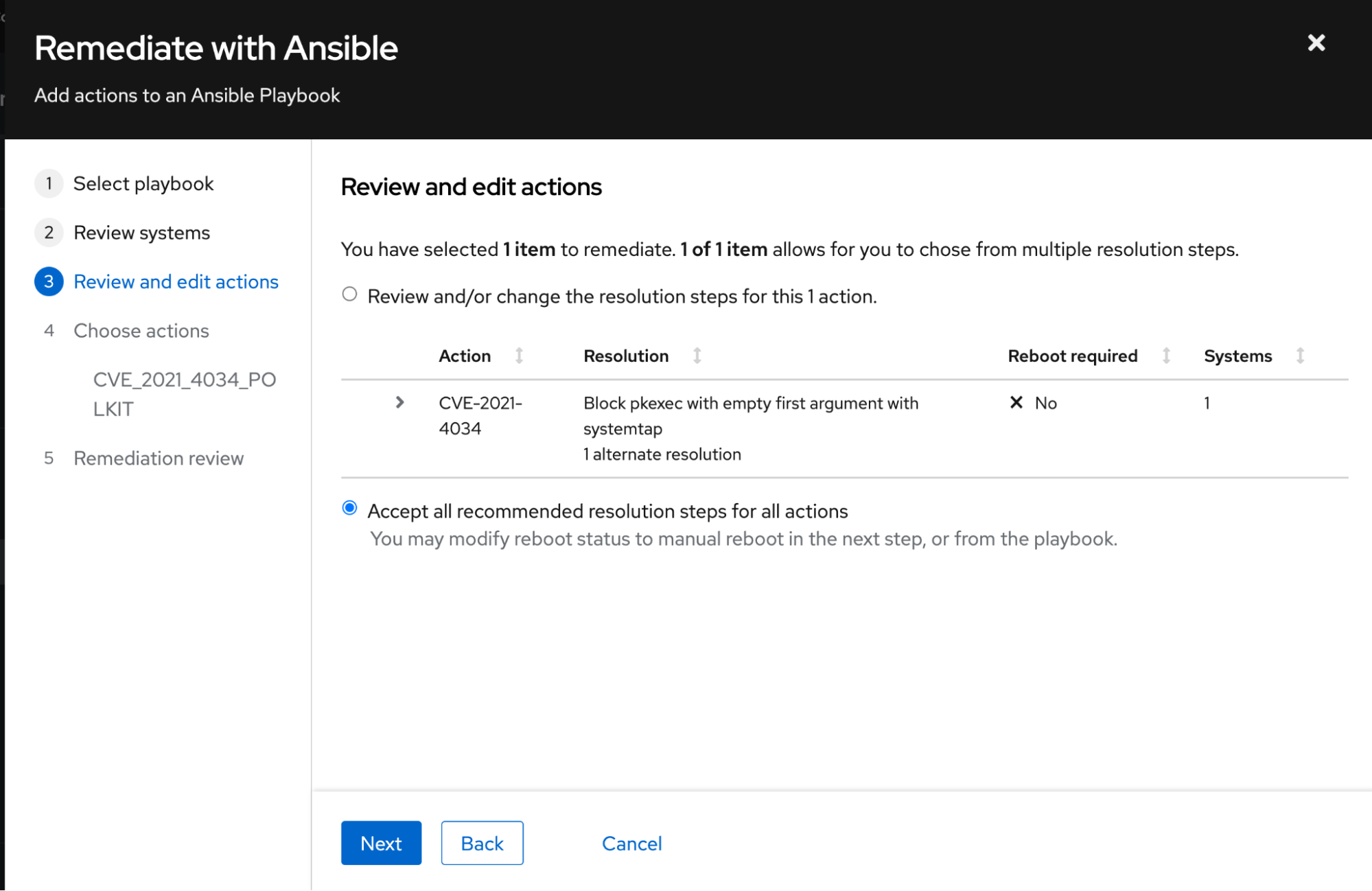 If I check the box next to the system name, as shown in the image above the “Remediate” button becomes available. This will start the process of generating an Insights playbook that you can either download and run on your own (or sync with your Ansible Automation Platform environment) or execute directly from Insights.