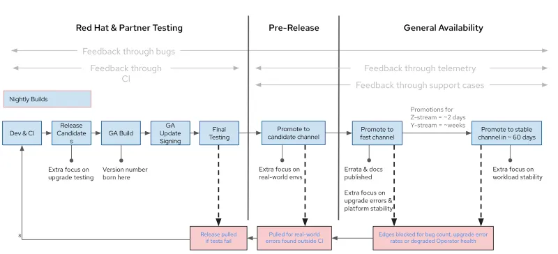 As shown in Image-5, a new release is initially added to the candidate channel and, after a lot of successful testing, promoted to the fast channel. The red boxes above highlight the three main points when an issue might be identified and what is done about it. The new, fully supported releases are broadly available on both fast and stable channels, and what sets these two channel variants apart is the release timing. Red Hat's automated testing is improved by information gleaned from all channels (including candidate, fast, and stable channels).