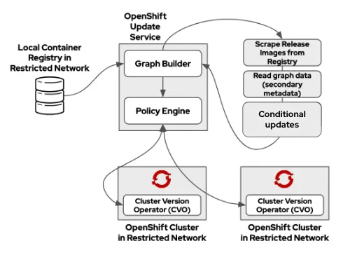 After mirroring is complete, the cluster administrator has to install the OSUS operator to get an update experience similar to connected clusters. The metadata contained within the OpenShift release payloads stored in the local container registry is used by the graph-builder component of OSUS to construct an update graph. Once the on-premises OpenShift Update Service endpoint has been configured in the Cluster Version Operator (CVO), the cluster can benefit from the policy engine ( a cluster-specific filter that returns cluster-specific update recommendations) as soon as the release-payload has been mirrored to the neighborhood container registry. This allows administrators to quickly and easily update clusters using the web portal or command line interface.