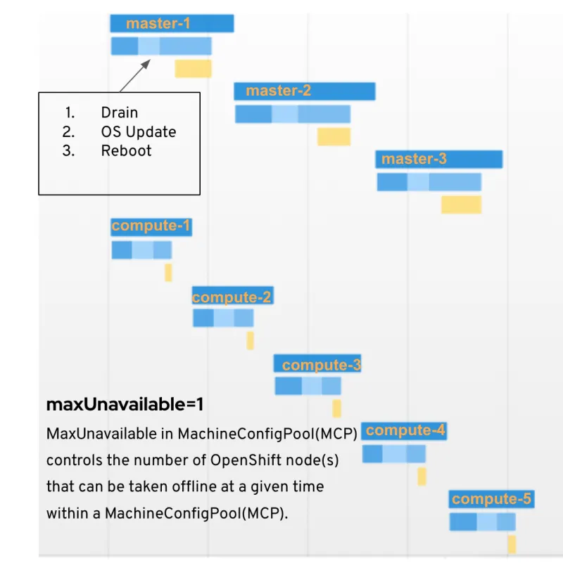 Machine Config Operator (MCO) manifests is applied toward the end of the control plane update process. The MCO then begins updating the system configuration and operating system of every node. Updates to the Worker Nodes and Control Plane nodes are done by MCO, and each node must be drained, updated, and rebooted before it starts to accept workloads again. This is shown in Image-11.