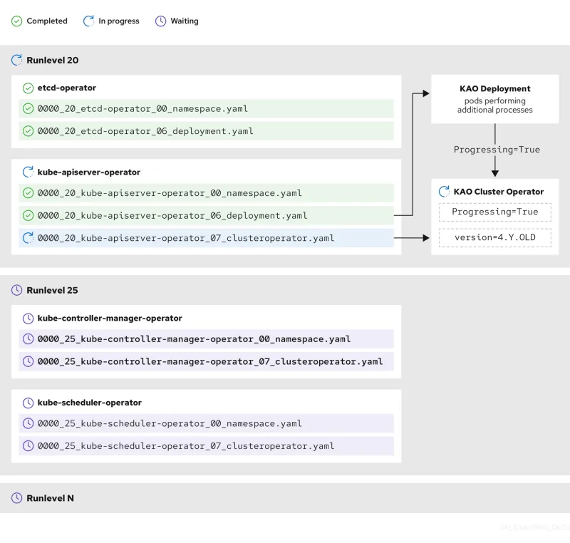 When updating the cluster to a new version, the CVO applies manifests in separate stages called Runlevels(shown in Image-9). Runlevels take care of the logical order. As the CVO applies a manifest to a cluster Operator, the Operator might perform update tasks to reconcile itself with its new specified version. The CVO monitors the state of each applied resource and the states reported by all cluster Operators. The CVO only proceeds to the next runlevel with the update when all manifests and cluster Operators in the active Runlevel are stable. After the CVO updates the entire control plane through this process, the Machine Config Operator (MCO) updates the operating system and configuration of every node in the cluster.