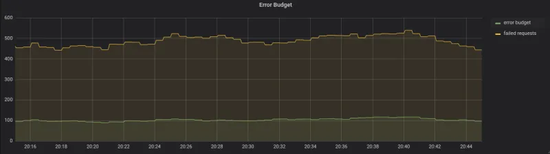 In this view, we see that given the SLO and the amount of requests received in the observation window, the average error budget would be 100 failed requests, but we actually have an average of 500 failed requests.