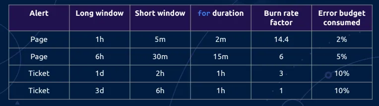 Here is how you read the first line of the above table: We want to be alerted if 2 percent of the error budget is consumed in an hour (long window column). This implies a burn rate factor of 14.4 (this can be deduced mathematically). The short control window will be 1.12th of an hour, which is five minutes.