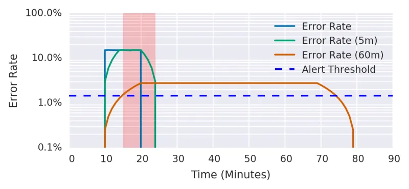 An aside regarding this diagram: I took this diagram with a lot of trust from the SRE book. If you are a statistician, you should be able to recreate that graph and customize it as necessary by changing the magic numbers of the table above (I didn’t invest time in creating that model).