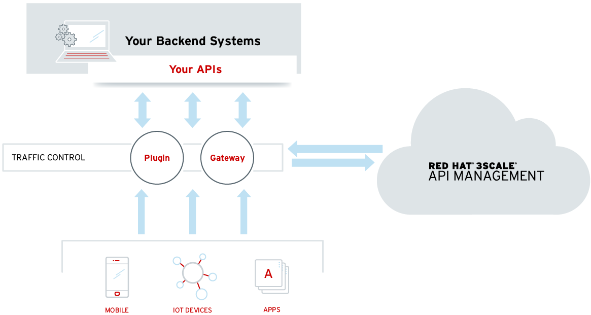 Faça a integração com o Red Hat 3scale API Management usando componentes autogerenciados ou de nuvem que oferecem controle de tráfego, segurança e implementação de políticas de acesso.